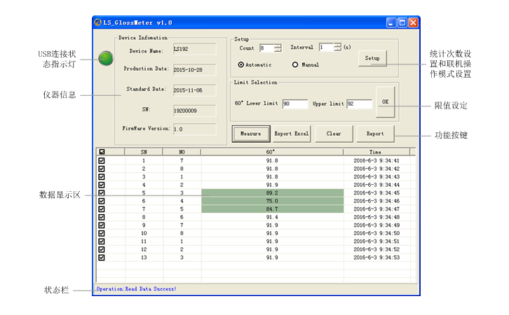 電腦軟件界面是由儀器信息欄,USB連接狀態(tài)指示燈,設(shè)置欄,功能按鍵和數(shù)據(jù)顯示區(qū)組成。